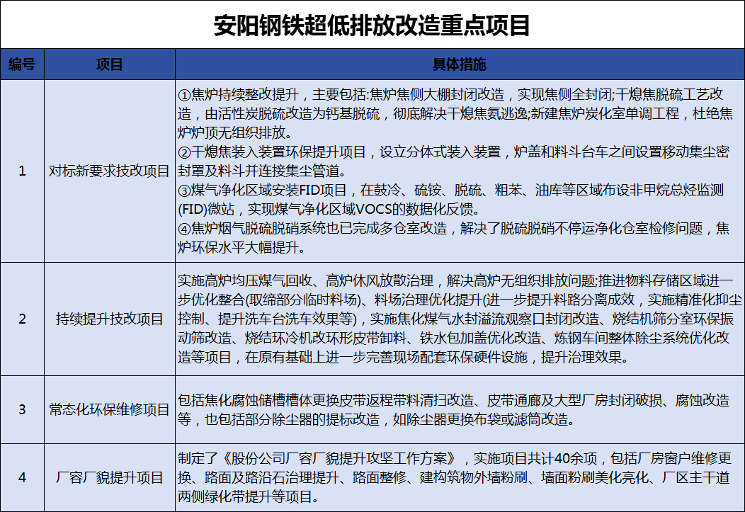 安鋼全面對照鋼鐵超低排放改造要求,積極考察、對標近年來超低改造示范企業(yè),全面摸底,并重點針對上級部門幫扶提出的整改意見,形成整改清單,明確責任人、責任領導,倒排工期,有序推進,并實施項目清單銷號管理,全力推進環(huán)境治理整改提升。改造項目共計100余項,涉及總投資近6.4億元,重點包括以下幾類項目: