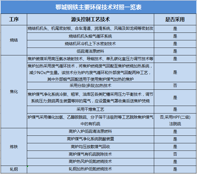 鄂城鋼鐵已實現(xiàn)原料系統(tǒng)機械化全封閉料場,廠內全封閉皮帶通廊料;燒結機機頭煙氣采用靜電除塵器+SDA脫硫+SCR脫硝;高爐礦槽、出鐵采用覆膜濾料除塵器;焦爐煙氣采用碳基催化氧化脫硫+SCR脫硝,裝煤、推焦干熄焦均采用覆膜濾料除塵器;轉爐一次煙氣采用LT干法靜電除塵,轉爐二煙氣采用覆膜濾料除塵器,并建有屋頂三次除塵系統(tǒng),以控制煉鋼車間無組織放;軋鋼熱處理爐均實施低氮燃燒/煙氣循環(huán)改造,完成實現(xiàn)