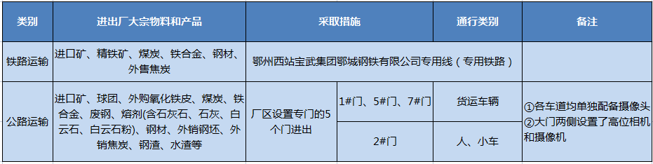 鄂城鋼鐵進出廠區(qū)的大宗物料和產品主要采用鐵路運輸、汽車運輸。鐵路運輸由專用鐵路承擔,進出廠大宗物料和產品,包括進口礦、精鐵礦、煤炭、鐵合金、鋼材、外售焦炭等;大宗物料及產品汽車運輸通過廠區(qū)專門的門進出廠,進出廠大宗物料和產品包括進口礦、球團、外購氧化鐵皮、煤炭、鐵合金、廢鋼、熔劑(含石灰石、石灰、白云石、白云石粉)、鋼材、外銷鋼坯、外銷焦炭、鋼渣、水渣等。
