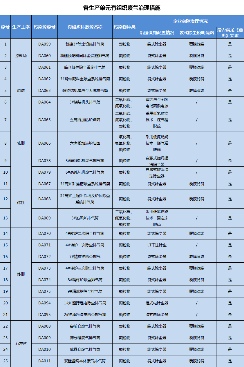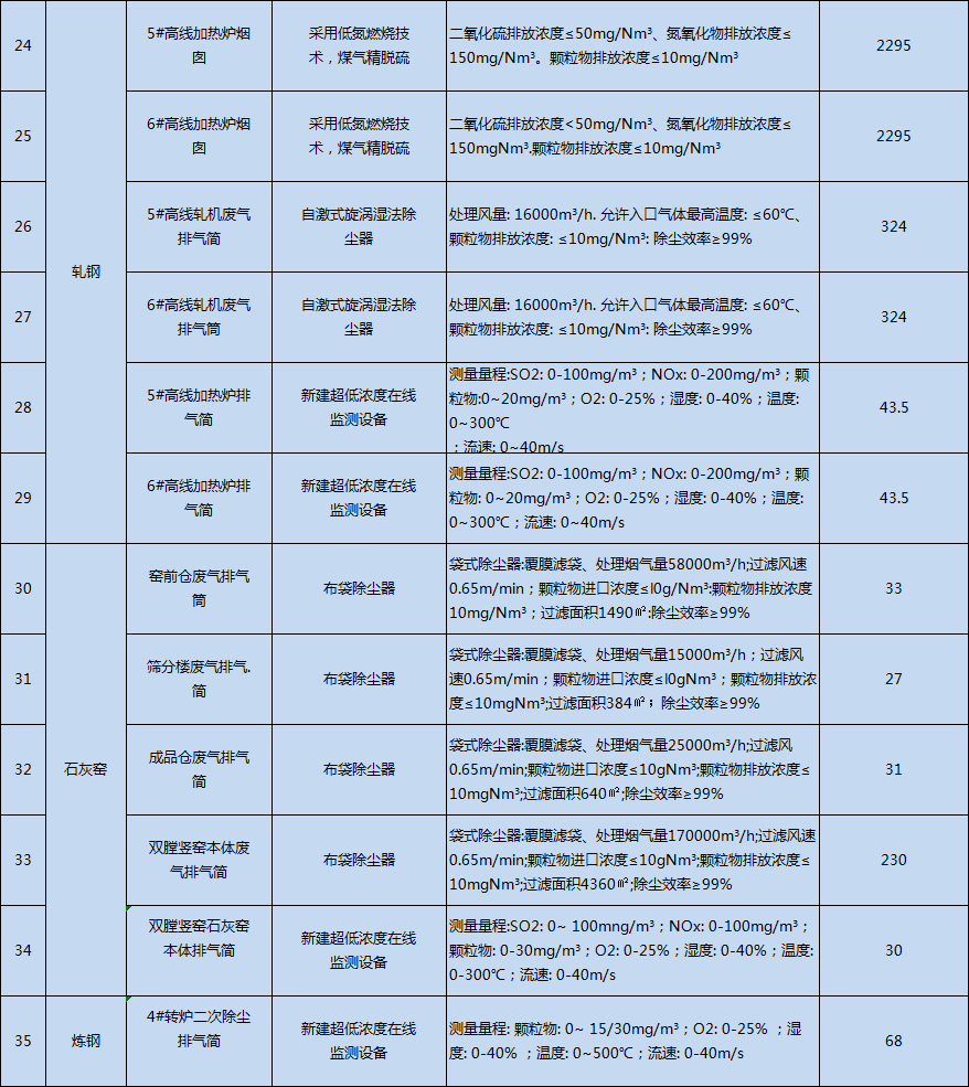 對(duì)全廠25個(gè)有組織排放源,根據(jù)不同的工序和污染物種類等,分別配備不同的治理設(shè)施進(jìn)行有效的治理控制,降低污染的產(chǎn)生,滿足超低排放要求。
