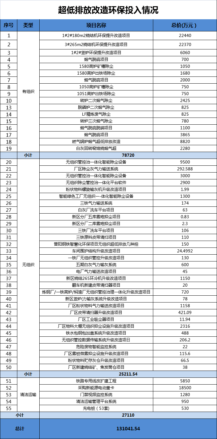 普陽鋼鐵共投入近20億元環(huán)保治理資金累計實施燒結(jié)機(jī)脫硫、脫硝、除塵、豎爐脫硫脫硝、脫白、白灰窯脫硫脫硝除塵、煉鐵除塵、軋鋼加熱爐脫硫脫硝、封閉料場、超低排放集中控制系統(tǒng)等100余項環(huán)保提升治理項目,其中包括:有組織排放改造投入約7.87億元,無組織排放改造投入約2.52億元,清潔運輸改造約2.71億元,其他投入約6.9億元等。