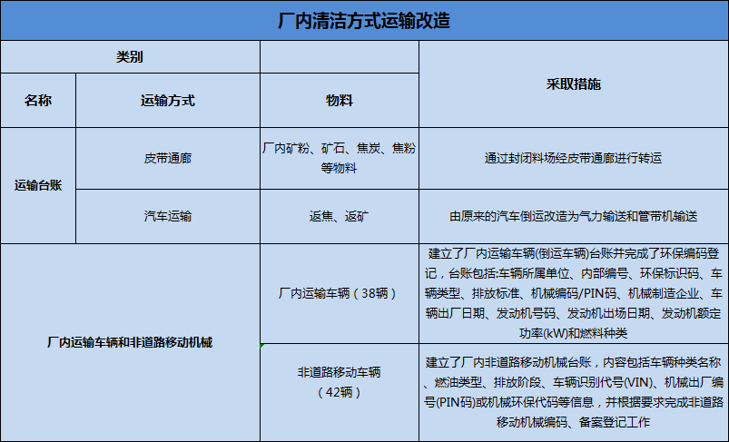 廠內(nèi)礦粉、礦石、焦炭、焦粉等物料全部通過封閉料場經(jīng)皮帶通廊進(jìn)行轉(zhuǎn)運(yùn),同時投資1338萬元將返焦、返礦由原來的汽車倒運(yùn)改造為氣力輸送和管帶機(jī)輸送;并對于38臺廠內(nèi)運(yùn)輸車輛及42臺非道路移動機(jī)械分別建立了對應(yīng)臺賬并完成了環(huán)保編碼登記、備案登記工作。