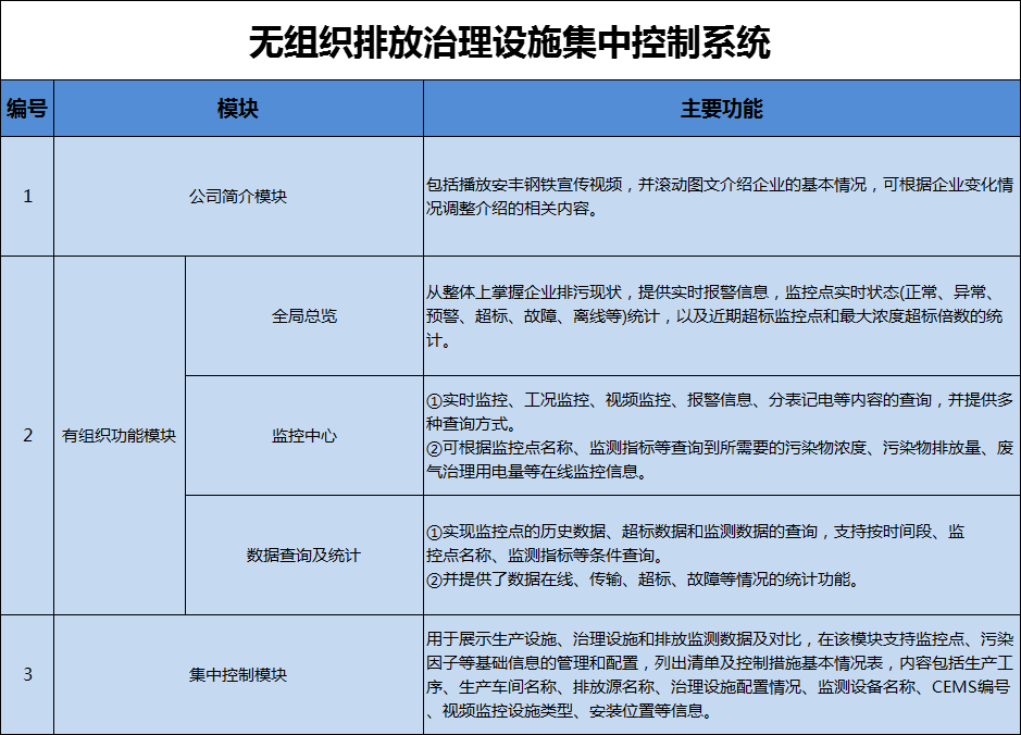 安豐鋼鐵建設(shè)了無組織排放管控治一體化平臺系統(tǒng),主要包括公司簡介、有組織管控、無組織管控、集中控制系統(tǒng)、視頻監(jiān)控、智能報表等功能模塊,利用物聯(lián)網(wǎng)、大數(shù)據(jù)等智能技術(shù),將現(xiàn)場端監(jiān)測數(shù)據(jù)、系統(tǒng)平臺和管理措施進行集成,實現(xiàn)污染源管控、預(yù)警和治理管控措施聯(lián)動,支持日常環(huán)境管理及輔助應(yīng)急決策處置等。