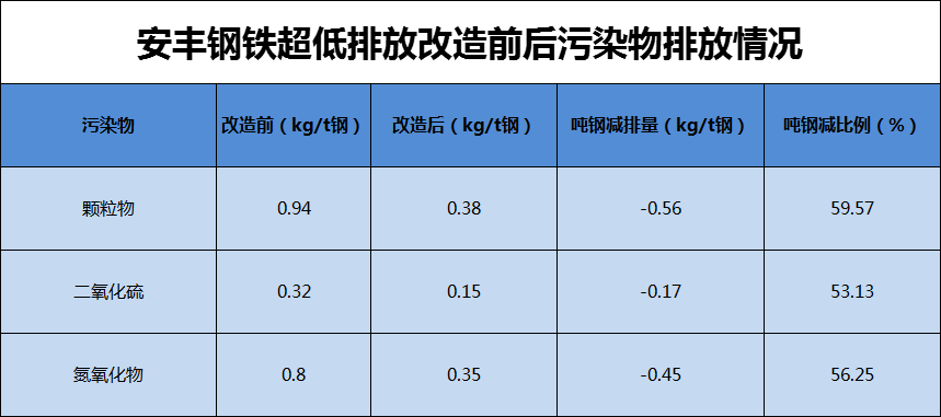 通過超低排放改造,安豐鋼鐵噸鋼污染物排放量明顯下降,顆粒物、二氧化硫和氮氧化物噸鋼污染物排放量分別下降了59.57%、53.13%和56.25%,超低改造以來在全廠重點廢氣排放除塵及脫硫脫硝方面取得了顯著成效。