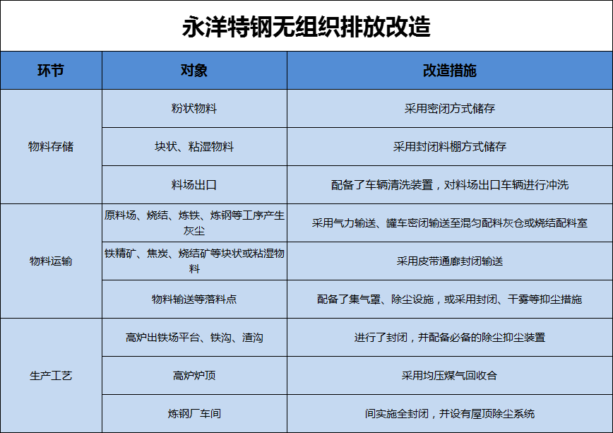 永洋特鋼與京誠(chéng)嘉宇公司共同建立了工作組,對(duì)物料儲(chǔ)存、物料輸送、生產(chǎn)工藝等方面進(jìn)行了全面梳理,共梳理無(wú)組織源清單738項(xiàng),建立了全廠無(wú)組織排放清單。并針對(duì)不符合《意見(jiàn)》中要求的事項(xiàng)進(jìn)行6個(gè)多月的整改,完成提質(zhì)改造。