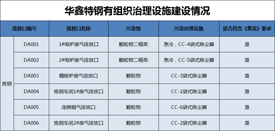 有組織排放改造方面,華鑫特鋼各工序采用了成熟適用的環(huán)保改造技術(shù),電爐煙氣采用第四孔爐內(nèi)排煙+密閉罩+屋頂罩的捕集方式,爐內(nèi)排煙采用急冷+袋式除塵器的治理技術(shù),其余點(diǎn)位均采用