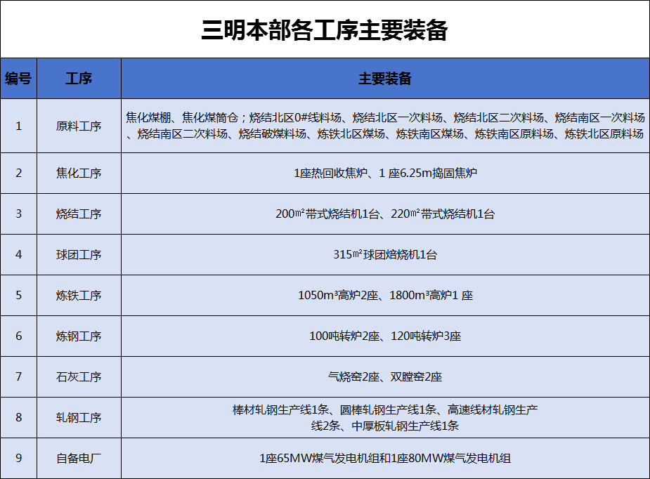 三明本部主要生產(chǎn)系統(tǒng)包括原料工序、焦化工序、燒結工序、球團工序、煉鐵工序、煉鋼工序、石灰工序、軋鋼工序、自備電廠等,各工序主要裝備情況如下: