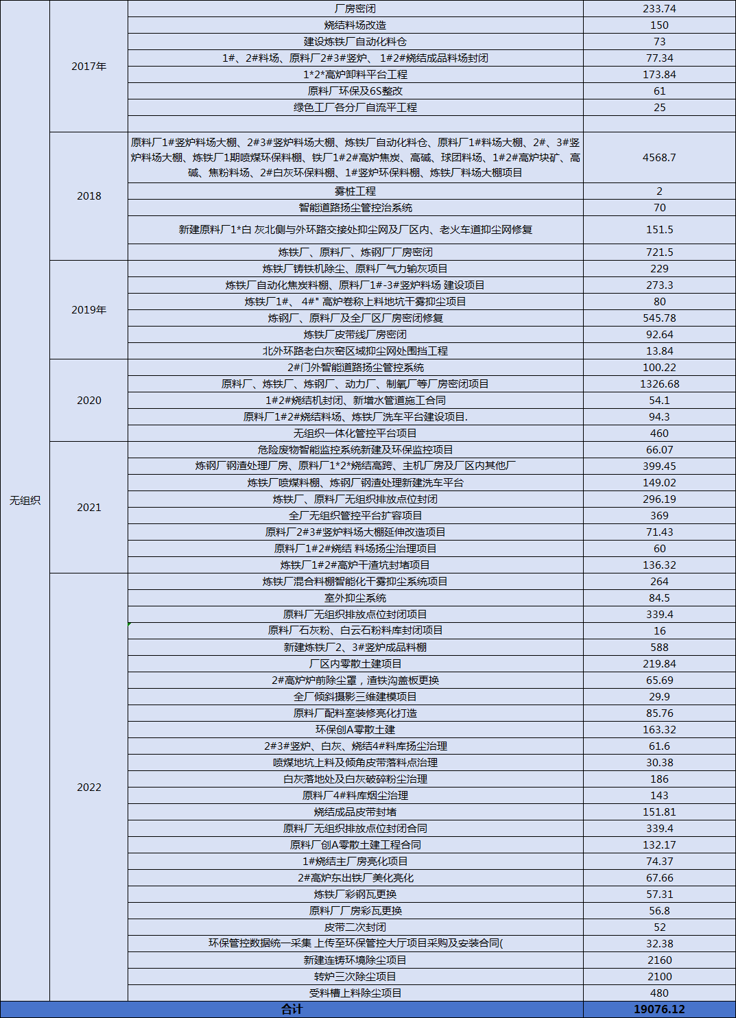 對物料儲存、物料輸送、生產(chǎn)工藝等方面進(jìn)行了全面梳理,建立全廠無組織排放清單,并對不符合要求的無組織排放源進(jìn)行粉塵治理技術(shù)升級改造。