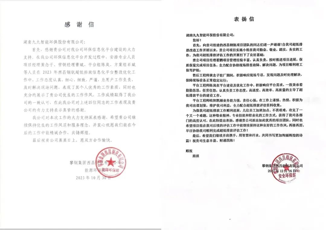 項(xiàng)目建設(shè)過(guò)程中,九九智能環(huán)保項(xiàng)目組以其專(zhuān)業(yè)品質(zhì)和高效服務(wù),獲得業(yè)主單位西昌鋼釩發(fā)來(lái)的表?yè)P(yáng)信,對(duì)九九智能環(huán)保項(xiàng)目團(tuán)隊(duì)優(yōu)質(zhì)履約能力給予了高度肯定!