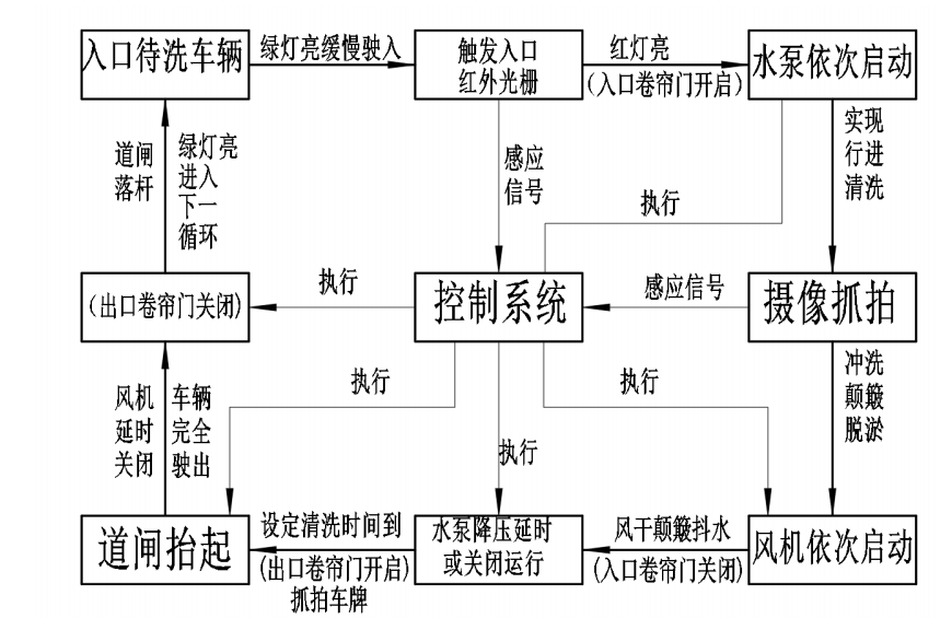 通過式洗車,車輛緩慢靠近洗車平臺,紅外光柵感應(yīng),車輛緩慢駛?cè)霙_洗顛簸抖塵區(qū),水泵自動啟動沖洗車輛+顛簸脫淤抖塵,車輛駛?cè)腼L(fēng)機(jī)吹干顛簸抖水區(qū),風(fēng)機(jī)自動啟動吹干車輛+顛簸抖水,防砸道閘自動抬桿,車輛緩慢駛出洗車機(jī)。洗車系統(tǒng)由側(cè)面沖洗和底部沖洗,風(fēng)機(jī)吹干和顛簸脫淤抖塵抖水系統(tǒng)組成。