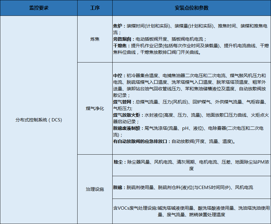 2、建立分布式控制系統(tǒng)(DCS),點位應(yīng)當(dāng)包括焦?fàn)t、旁路煙筒、裝煤地面站、推焦地面站、干熄焦地面站、煤氣控制中心、煤氣凈化、煤氣管網(wǎng)、煤氣放散系統(tǒng)、苯和焦油儲槽等生產(chǎn)設(shè)施及廢氣治理設(shè)施。