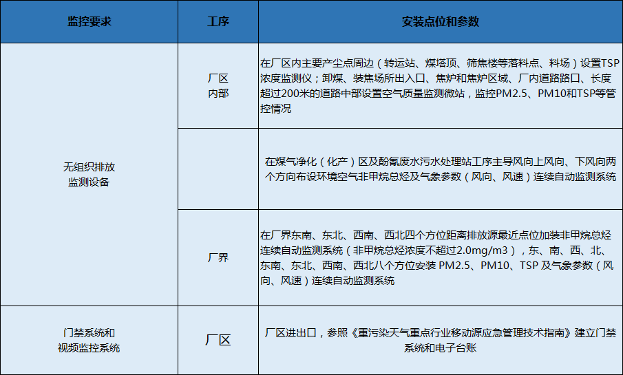 4、在廠區(qū)內(nèi)主要產(chǎn)塵點周邊(轉(zhuǎn)運站、煤塔頂、篩焦樓等落料點、料場)設(shè)置TSP濃度監(jiān)測儀;卸煤、裝焦場所出入口、焦?fàn)t和焦?fàn)t區(qū)域、廠內(nèi)道路路口和長度超過200米的道路中部設(shè)置空氣微站,監(jiān)控PM2.s、PM1o和TSP等管控情況,并接入無組織排放管控治平臺;在煤氣凈化、化產(chǎn)品回收及污水處理站工序主導(dǎo)風(fēng)向上風(fēng)向、下風(fēng)向兩個方向布設(shè)環(huán)境空氣非甲烷總烴及氣象參數(shù)(風(fēng)向、風(fēng)速)連續(xù)自動監(jiān)測系統(tǒng),并接入管控治平臺。