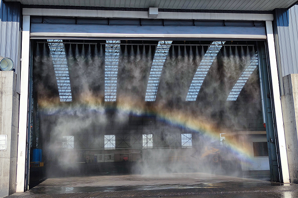 干霧抑塵技術(shù)通過(guò)噴射細(xì)小的水霧粒子在空氣中與粉塵顆粒發(fā)生作用,將粉塵濕化、粘附到水霧顆粒上,并通過(guò)重力沉降或被大氣濕度吸收沉降至地面,有效減少粉塵排放。