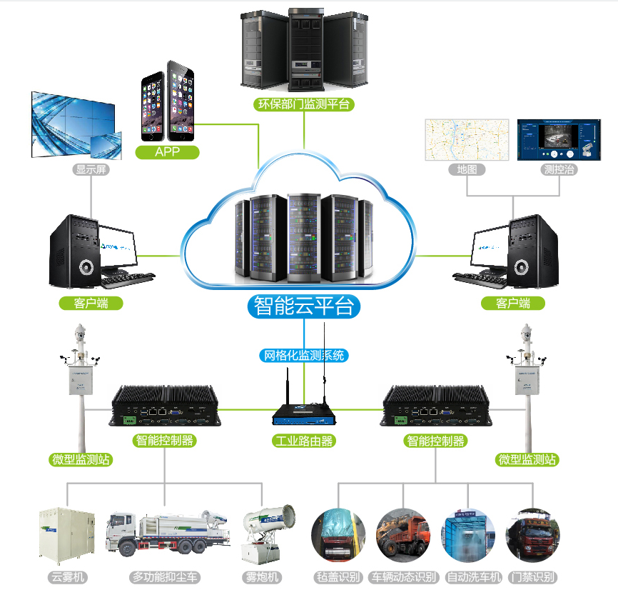 最后,通過智能管、控、治一體化技術(shù),綜合管控、運(yùn)營整個抑塵系統(tǒng)工程,實時監(jiān)測現(xiàn)場除塵情況,智能調(diào)節(jié)除塵參數(shù),最大限度降低除塵系統(tǒng)運(yùn)營成本,同時保證長期穩(wěn)定的除塵效果。真正實現(xiàn)對無組織排放的網(wǎng)格化、精確化、科學(xué)化、智能化的治理。