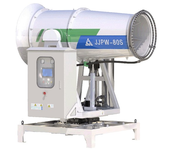 霧炮采用噴霧重力降塵技術(shù),通過(guò)高壓水泵加壓將水從專(zhuān)用噴嘴噴出,霧化成與粉塵顆粒大小相當(dāng)?shù)乃F(水霧顆粒直徑約30~200μm);在風(fēng)機(jī)吹動(dòng)的氣流作用下,將水霧定向吹射到塵源上方及其周?chē)M(jìn)行水霧覆蓋,粉塵顆粒與水霧顆粒產(chǎn)生接觸、碰撞、使粉塵顆粒相互粘結(jié)、凝聚變大,在自身的重力作用下沉降至地面,以此達(dá)到較佳的除塵效果。