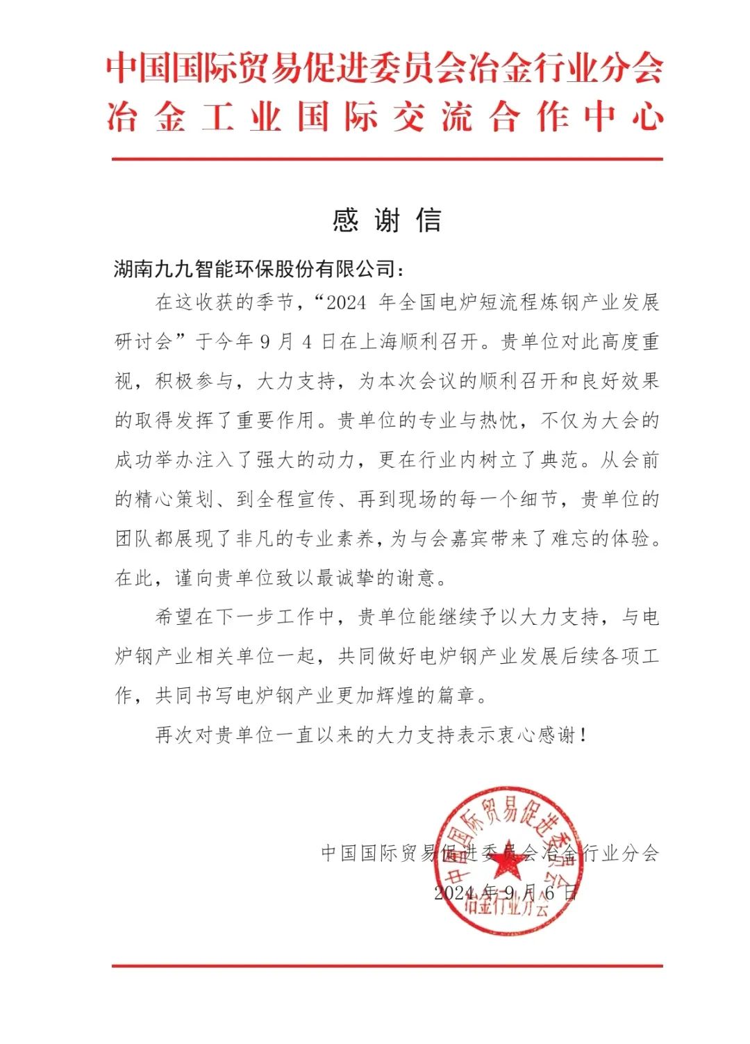 9月6日,九九智能環(huán)保收到了來自中國國際貿(mào)易促進委員會冶金行業(yè)分會發(fā)來的感謝信。信中提到,在剛剛落下帷幕的2024年全國電爐短流程煉鋼產(chǎn)業(yè)發(fā)展研討會中,九九智能環(huán)保作為協(xié)辦單位在會前的精心策劃到全程宣傳過程中為本次的會議召開發(fā)揮了重要作用。