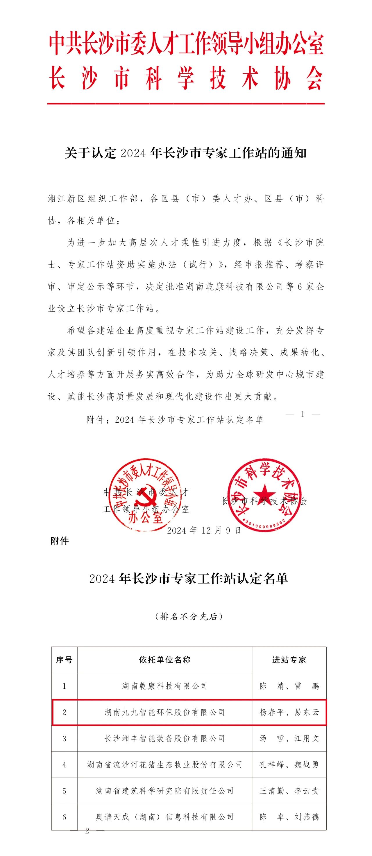 為進一步加大高層次人才柔性引進力度,根據(jù)《長沙市院士、專家工作站資助實施辦法(試行)》,經(jīng)申報推薦、考察評審、審定公示等環(huán)節(jié)。12月9日,中共長沙市委人才工作領導小組辦公室、長沙市科學技術協(xié)會決定批準6家企業(yè)設立長沙市專家工作站,其中湖南九九智能環(huán)保股份有限公司位列其中。