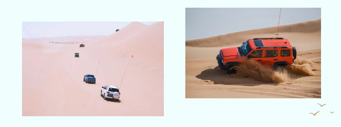 當(dāng)硬派越野車一頭扎進無邊無垠的沙海,引擎轟鳴,在巨大的沙丘間起伏、沖刺、俯沖。每一次沖向陡峭的沙脊,視野瞬間被藍天占據(jù),心懸到嗓子眼;緊接著,是近乎垂直的俯沖,失重感伴隨著驚呼和腎上腺素飆升。車輪卷起漫天沙塵,車身劇烈地顛簸、傾斜,仿佛隨時可能側(cè)翻,卻又在經(jīng)驗豐富的司機手中一次次化險為夷,穩(wěn)穩(wěn)地沖上下一道沙梁。
