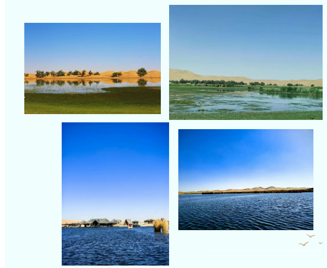 騰格里的魅力,就在于穿越無窮無盡的沙丘之后,歷經(jīng)顛簸與心跳,終被天地的大美所犒賞:血珀般的烏蘭湖如大地跳動的熾熱心臟,驟然撞入眼簾;澄澈如鏡的楓葉湖,倒映著藍天白云,仿佛遺落人間的天空之境;蛋黃湖、吉他湖、駱駝湖……散落的“地球之心”鑲嵌在這片無垠的荒漠之中,綻放出生命的奇跡。