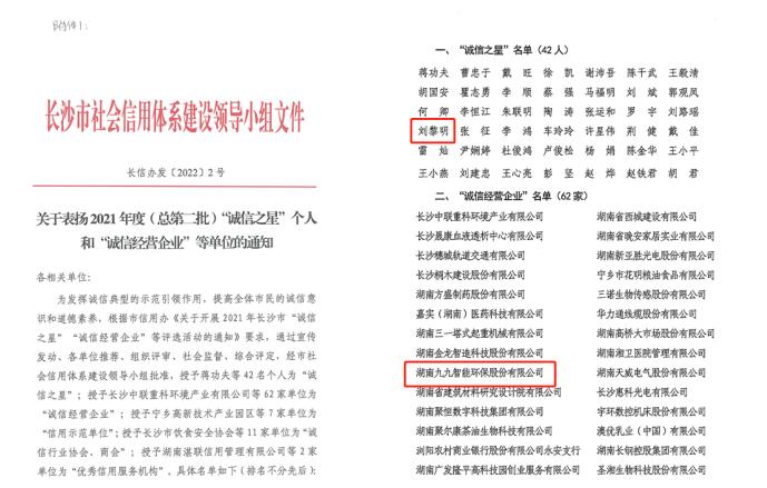 近日,長沙市信用辦公布了2021年度長沙市“誠信之星”“誠信經(jīng)營企業(yè)”等名單,湖南九九智能環(huán)保環(huán)保股份有限公司榮獲“誠信經(jīng)營企業(yè)”榮譽稱號,九九智能環(huán)保董事長劉黎明同時榮獲“誠信之星”榮譽稱號。榮譽的背后,既是對企業(yè)的肯定,又是對未來的期望。