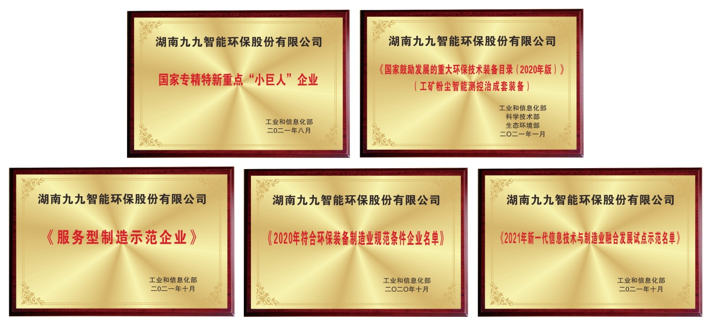 九九智能環(huán)保先后榮膺國家專精特新重點“小巨人”、國家服務(wù)型制造示范企業(yè)、國家新一代信息技術(shù)與制造業(yè)融合示范企業(yè)、工信部符合《環(huán)保裝備制造行業(yè)(大氣治理)規(guī)范條件》企業(yè)名單、《國家鼓勵發(fā)展的重大環(huán)保技術(shù)裝備目錄》等榮譽稱號。