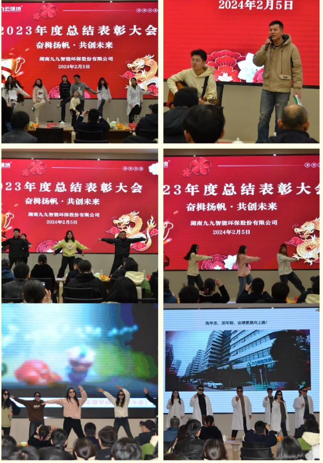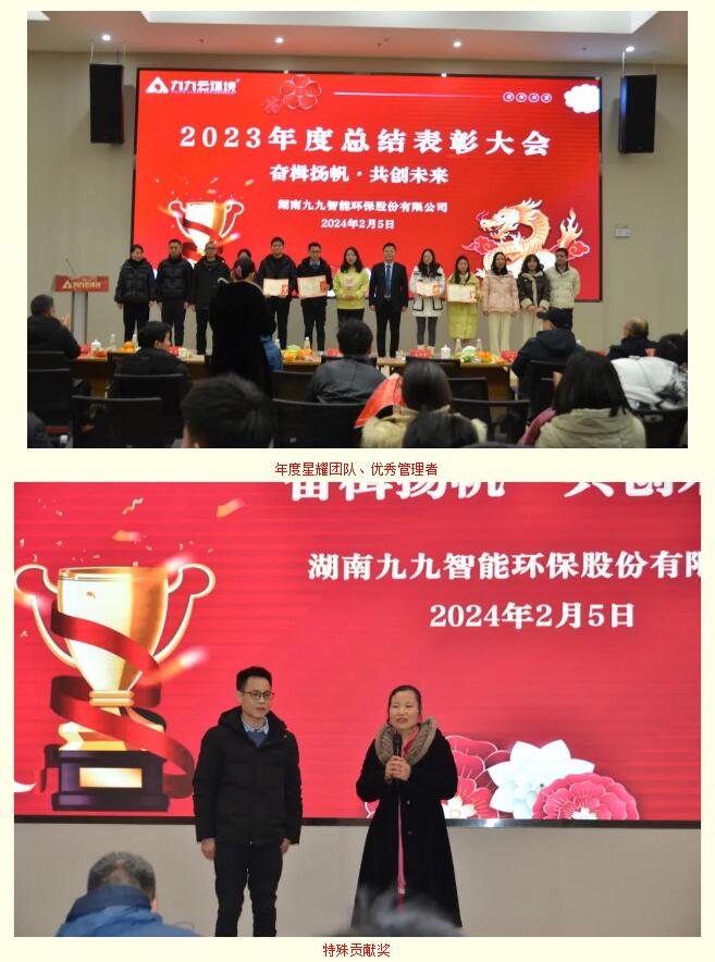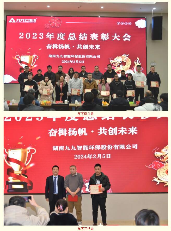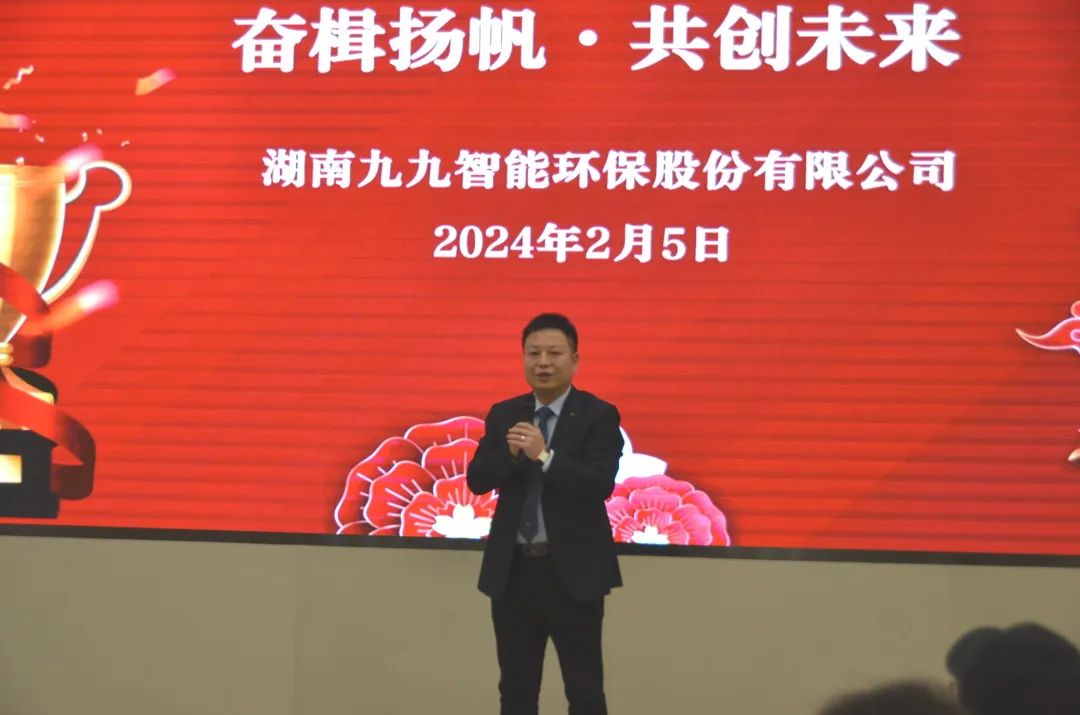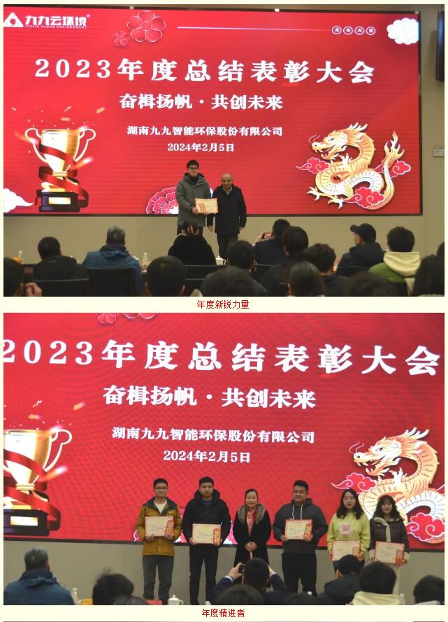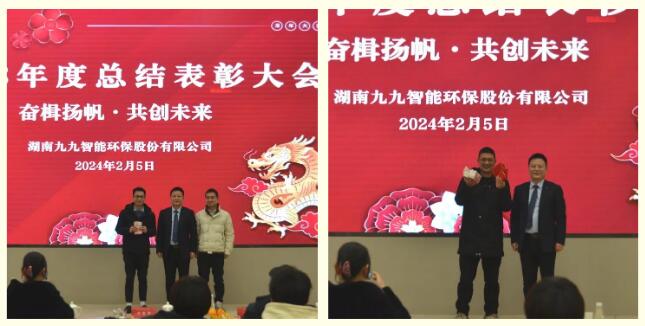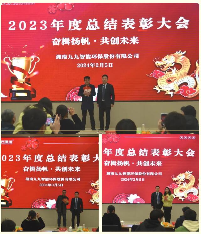 2024年2月5日,九九智能環(huán)保以“奮楫揚(yáng)帆,共創(chuàng)未來(lái)”為主題的2023年總結(jié)表彰大會(huì)隆重舉行,對(duì)過(guò)去一年為公司發(fā)展做出重要貢獻(xiàn)的優(yōu)秀員工予以表彰,同時(shí)對(duì)2024年工作作出展望和重要部署。九九總部及子公司全體員工歡聚一堂,部分依然奮戰(zhàn)在項(xiàng)目一線的員工通過(guò)直播共同見(jiàn)證了這美好的時(shí)刻。