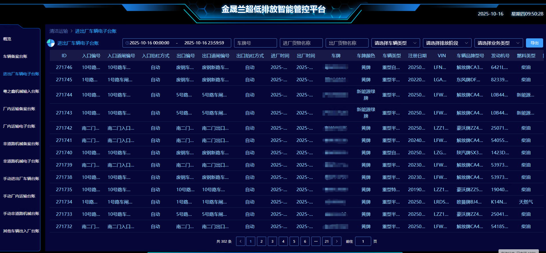 通過(guò)將現(xiàn)有門禁系統(tǒng)及地磅計(jì)量系統(tǒng)數(shù)據(jù)集成至超低排放智能管控平臺(tái),實(shí)現(xiàn)了對(duì)運(yùn)輸車輛信息的全面數(shù)字化管理。平臺(tái)實(shí)時(shí)采集并展示包括車輛運(yùn)輸物料類型(原料、燃料、輔料、廢污、成品)、名稱、重量、運(yùn)輸類型(收/發(fā)貨)、來(lái)源地、目的地、進(jìn)出廠時(shí)間、抓拍圖片、車牌號(hào)及排放階段(VIN)等關(guān)鍵數(shù)據(jù),形成完整、可追溯的清潔運(yùn)輸電子臺(tái)賬,為超低排放管控提供數(shù)據(jù)支撐。