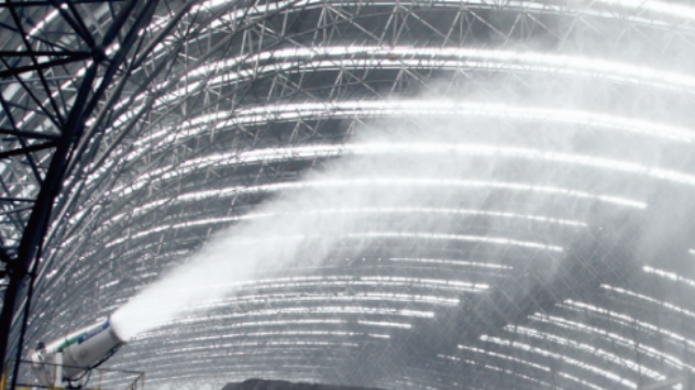 ②根據(jù)場(chǎng)內(nèi)除塵面積需求,在焦場(chǎng)內(nèi)邊界合適位置布置不同型號(hào)的固定型塔架式噴霧除塵機(jī),由于焦場(chǎng)場(chǎng)地普遍較大,該方案中采用的智能霧炮機(jī)可用80米-120米的遠(yuǎn)程霧炮機(jī),以對(duì)焦場(chǎng)實(shí)現(xiàn)全覆蓋。