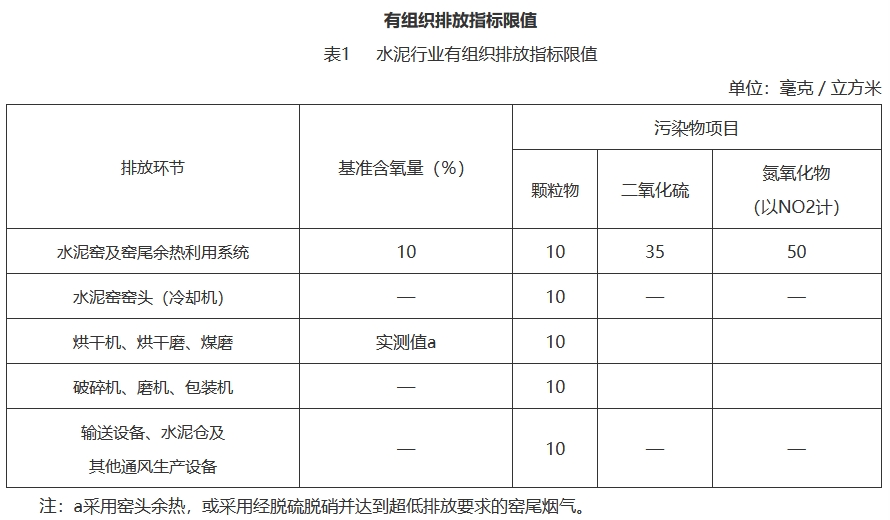 水泥企業(yè)在基準含氧量10%的條件下,水泥窯及窯尾余熱利用系統(tǒng)廢氣顆粒物、二氧化硫、氮氧化物排放濃度小時均值分別不高于10mg/m3、35mg/m3、50mg/m3。