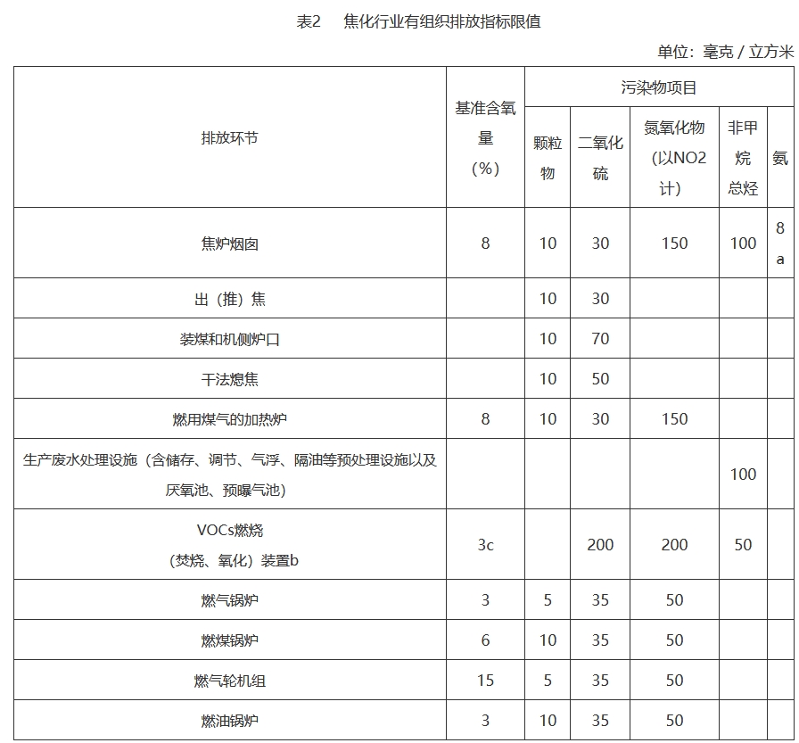 焦化企業(yè)在基準含氧量8%的條件下,焦爐煙囪廢氣顆粒物、二氧化硫、氮氧化物、非甲烷總烴、氨排放濃度小時均值分別不高于10mg/m3、30mg/m3、150mg/m3、100mg/m3、8mg/m3;生產(chǎn)廢水處理設施非甲烷總烴濃度小時均值不高于100mg/m3。其他污染源顆粒物排放濃度小時均值不高于10mg/m3。