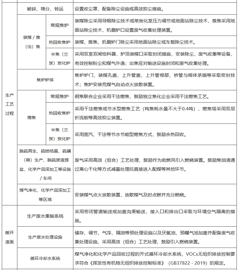 焦化企業(yè)焦爐采取正壓密封、磚縫灌漿、陶瓷焊補等源頭控制措施減少爐墻串漏。各類儲罐(槽、池)以及有機液體裝載點位收集的高濃度揮發(fā)性有機物(VOCs)廢氣接入壓力平衡系統(tǒng)或燃燒處理;脫硫再生、硫銨結晶、硫磺(膏)生產(chǎn)、脫硫廢液提鹽、焦油渣干化、生產(chǎn)廢水處理、化學產(chǎn)品深加工等設施或車間收集的低濃度VOCs廢氣采用高效(組合)工藝處理,鼓勵引入燃燒裝置。半焦爐裝煤采取有效措施控制無組織逸散,采用蒸汽、干法等節(jié)能環(huán)保型熄焦方式,加強出焦輸送設施封閉和廢氣收集處理。