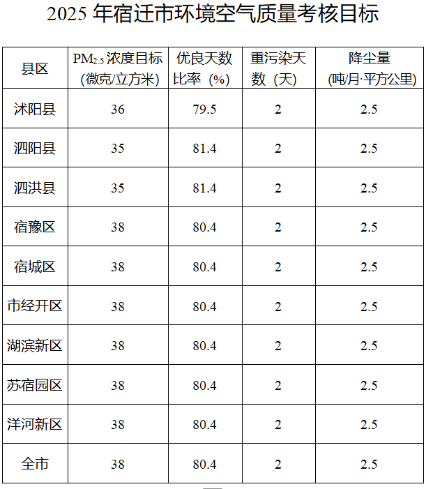 2025年全市PM2.5濃度達(dá)到38μg/m3及以下,空氣質(zhì)量?jī)?yōu)良天數(shù)比例達(dá)到80.4%,重污染天控制在2天以內(nèi)。完成省下達(dá)的氮氧化物、揮發(fā)性有機(jī)物減排目標(biāo)。各縣區(qū)空氣質(zhì)量實(shí)現(xiàn)持續(xù)改善,目標(biāo)詳見附件1。