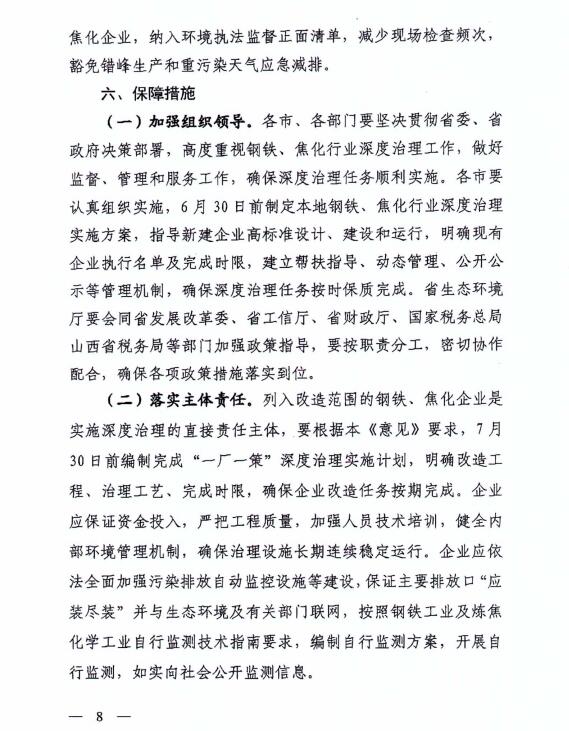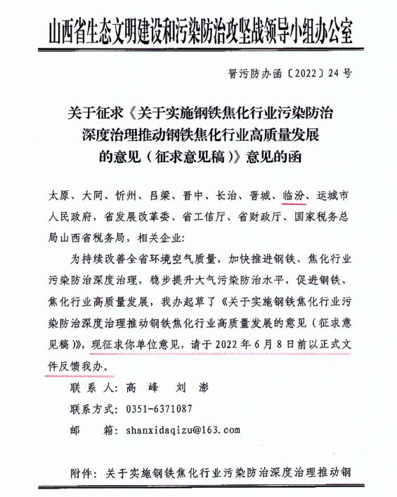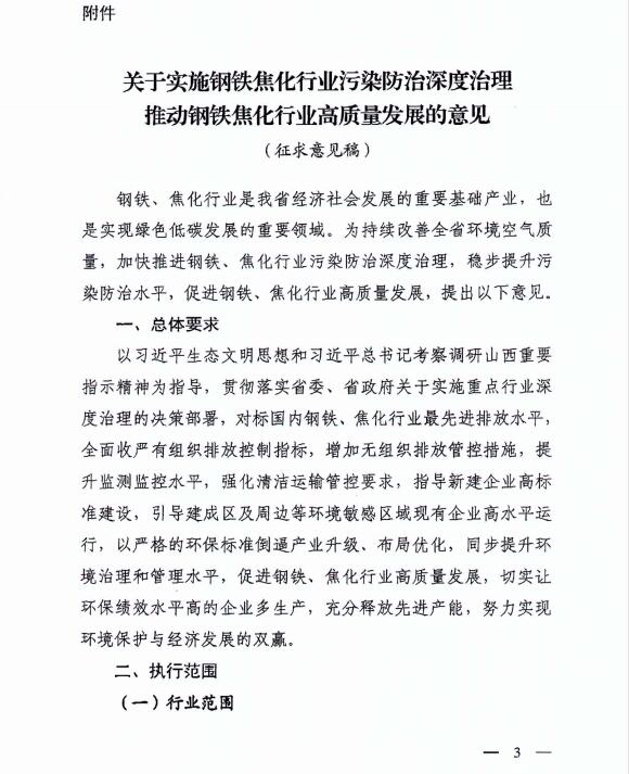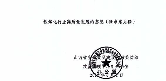 近日,山西省生態(tài)文明建設和污染防治攻堅戰(zhàn)領導小組辦公室發(fā)布了《關于實施鋼鐵焦化行業(yè)污染防治深度治理推動鋼鐵焦化行業(yè)高質量發(fā)展的意見(征求意見稿)》。詳情如下: