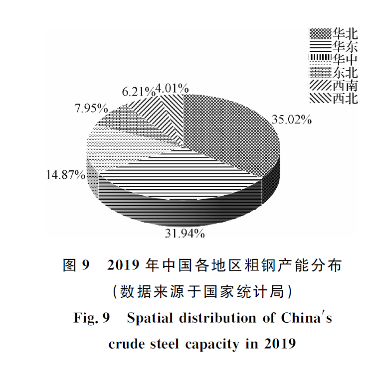 中國鋼鐵工業(yè)空氣污染物排放地域分布特點(diǎn)極其明顯,各地區(qū)鋼鐵工業(yè)空氣污染物排放差異顯著。中國鋼鐵工業(yè)空氣污染物排放量最大的區(qū)域是華北地區(qū)(京津冀),其次是華東地區(qū)(長三角)和華中地區(qū),分別排放SO2 572.52、531.11和276.45 kt,排放量所占比例如圖8所示。這是因?yàn)橹袊撹F產(chǎn)能主要集中在華北和華東地區(qū),2019年中國華北和華東地區(qū)的粗鋼產(chǎn)能所占比例分別為35.02%和31.94%(圖9),合計(jì)占中國總產(chǎn)能的67%左右。