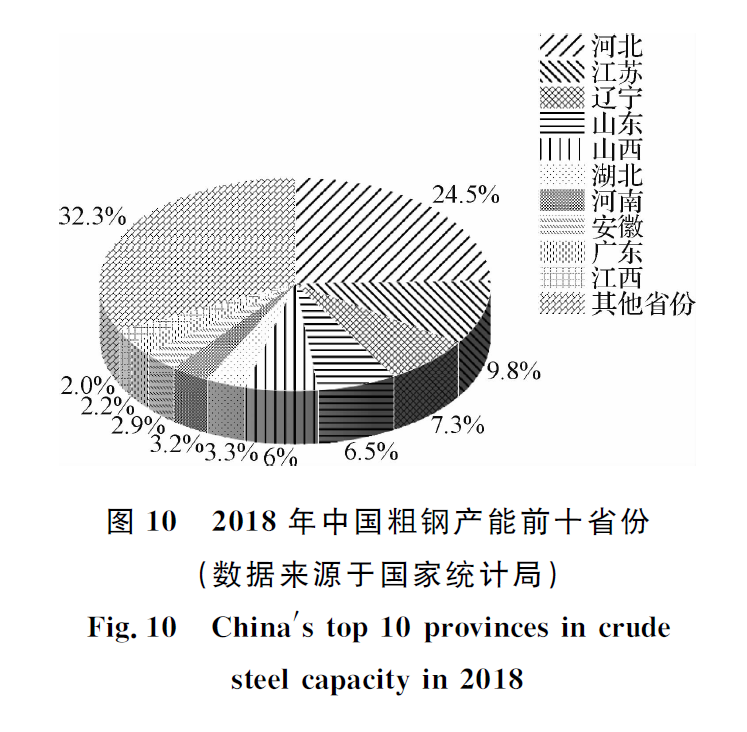 從中國各省份鋼鐵工業(yè)空氣污染物排放的統(tǒng)計(jì)結(jié)果來看,2012年中國鋼鐵工業(yè)SO2排放量前三的省份為河北、遼寧和江蘇,排放量所占比例分別為27.08%、10.04%和8.91%;NOx排放量前三的省份為河北、山東和江蘇,排放量占比分別為28.40%、9.00%和8.90%;PM2.5排放量前三的省份為河北、江蘇和遼寧,排放量所占比例分別為28.30%、9.11%和8.40%。據(jù)2018年數(shù)據(jù),中國鋼鐵工業(yè)SO2排放量靠前的三個省份依次為河北、遼寧和江蘇,排放量所占比例分別為17.69%、10.32%、10.17%;NOx排放量靠前的3個省份依然為河北、江蘇和山東,排放量所占比例分別為20.13%、11.34%、10.75%;PM10排放量靠前的3個省份依次為河北、江蘇和遼寧,排放量占比分別為18.94%、10.96%、9.33%。經(jīng)過多年的發(fā)展,主要空氣污染物排放省份并未發(fā)生變化,這主要與中國的鋼鐵產(chǎn)業(yè)分布有關(guān),河北、江蘇、山東和遼寧一直是中國鋼鐵產(chǎn)能最大的4個省份。這4個省份在2018年的粗鋼產(chǎn)能分別占中國總產(chǎn)能的24.5%、9.8%、7.3%和6.5%(圖10)。此外,從上述結(jié)果還可以發(fā)現(xiàn),從2012年到2018年中國第一產(chǎn)鋼大省河北省的鋼鐵工業(yè)空氣污染物排放大幅減小,這與河北省從2013年開始的去產(chǎn)能“6643”工程的成果息息相關(guān)。截止到2019年,河北省淘汰粗鋼產(chǎn)能共計(jì)11 941萬t。綜上分析,京津冀和長三角地區(qū)仍然是中國鋼鐵產(chǎn)業(yè)的主要區(qū)域,也是鋼鐵工業(yè)空氣污染物排放最嚴(yán)重的區(qū)域。