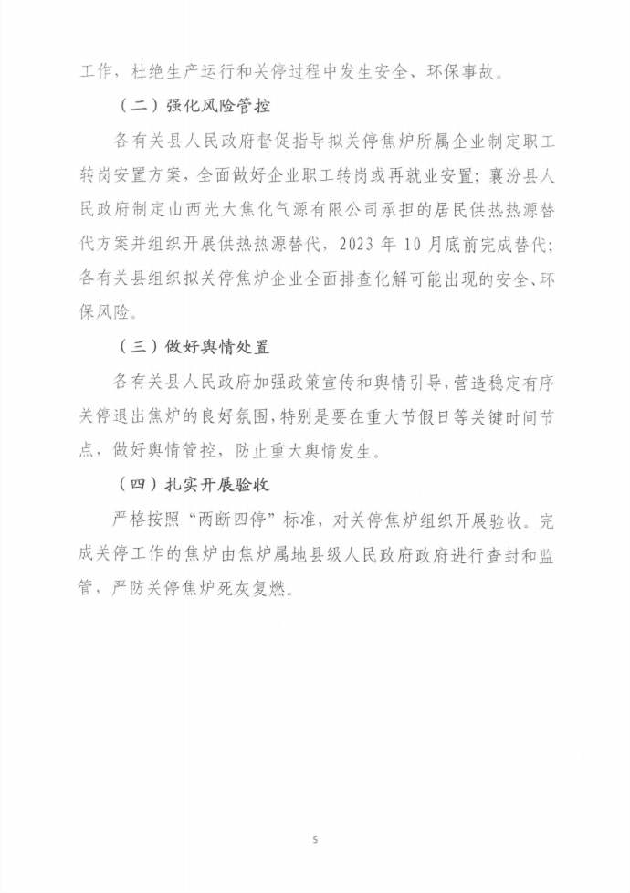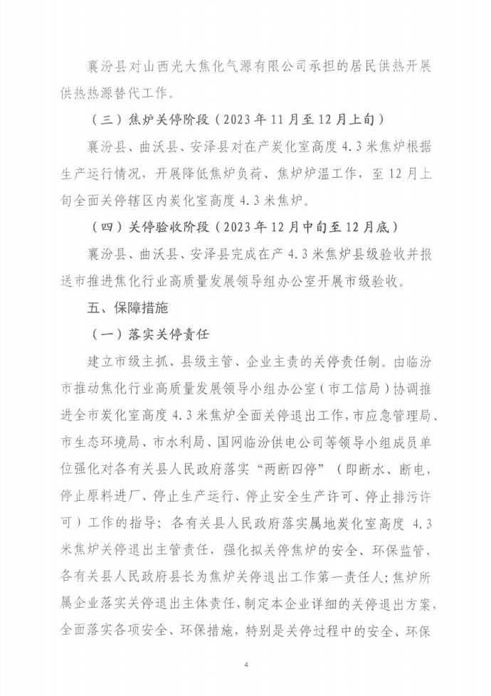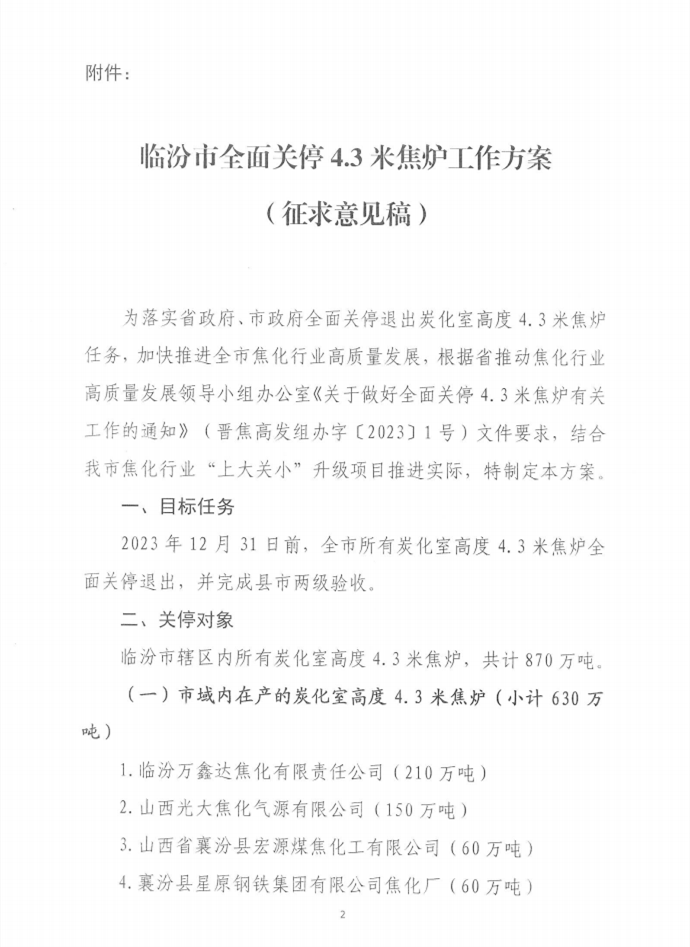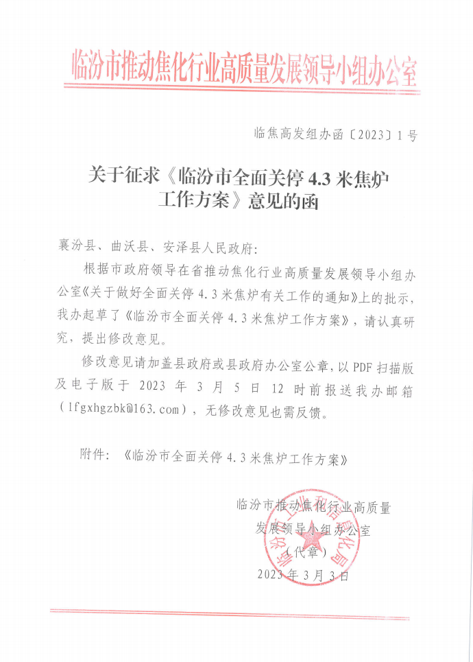 為了推送焦化行業(yè)高質(zhì)量發(fā)展,臨汾市領導小組辦公室發(fā)布關于征求《臨汾市全面關停4.3米焦爐工作方案》意見的函,要求2023年12月31日前,全市所有炭化室高度4.3米焦爐全面關停退出,并完成縣市兩級驗收。