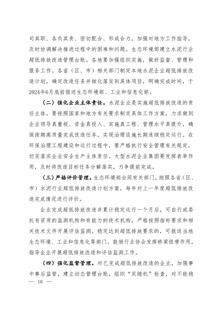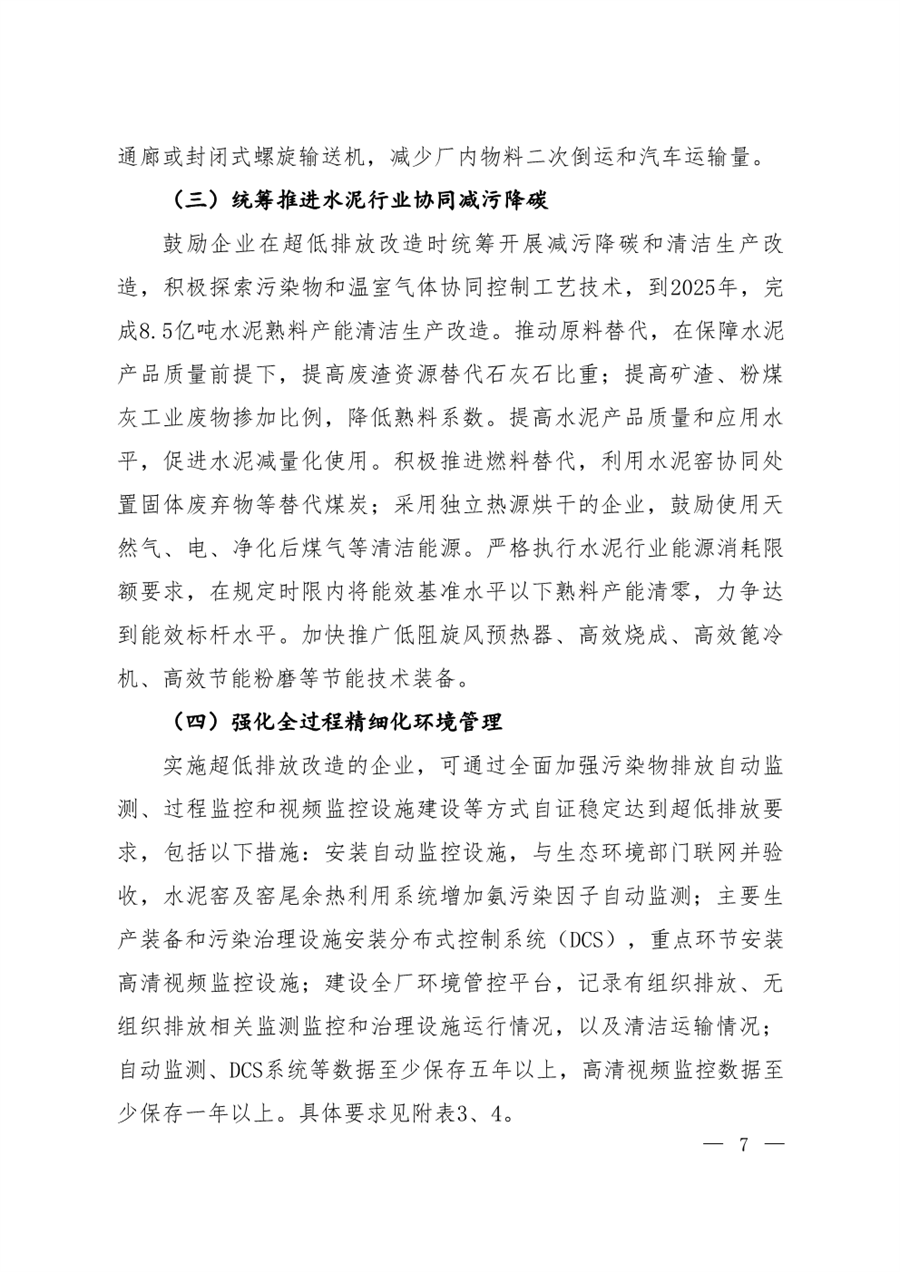 排放標準方面,在基準含氧量10%的條件下,水泥窯及窯尾余熱利用系統(tǒng)廢氣顆粒物、二氧化硫、氮氧化物排放濃度小時均值分別不高于10mg/m3、35mg/m3、50mg/m3。達到超低排放的水泥企業(yè)每月生產(chǎn)時間至少95%以上時段排放濃度小時均值滿足上述要求。